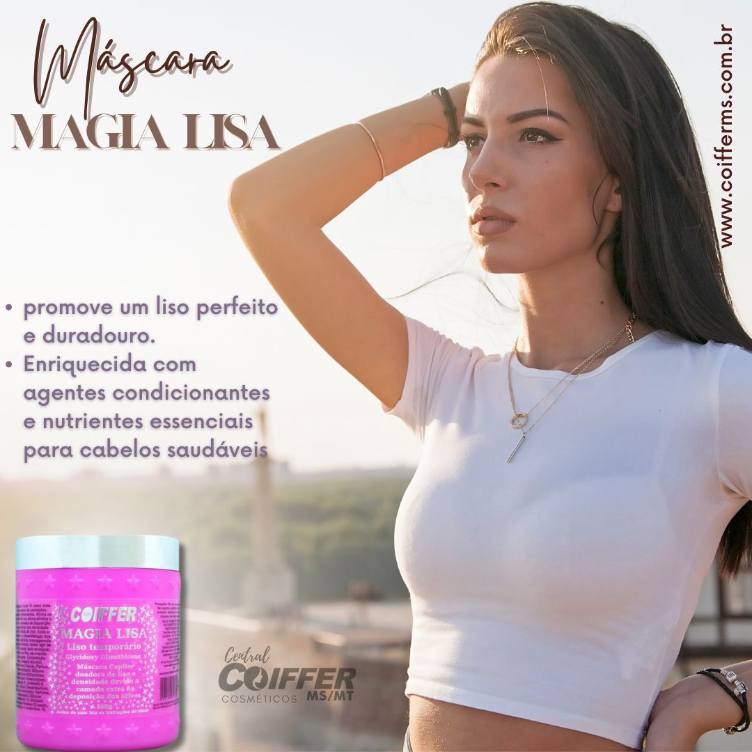 Máscara Magia Lisa 500g. Coiffer Liso temporário FINALIDADE: Durar 10 vezes mais os processos de penteados, escovas e alisamentos. Alinha os fios e devido aos ativos elimina o frizz e o processo de deposição de seus ativos doa densidade aos fios. Fórmula avançada desenvolvida para promover um liso perfeito e duradouro. Enriquecida com agentes condicionantes e nutrientes essenciais para cabelos saudáveis. Textura cremosa que facilita a aplicação e a absorção pelos fios. Adequado para todos os tipos de cabelo, inclusive os quimicamente tratados. Embalagem econômica de 500g para uso prolongado. Benefícios: Liso Sedoso: A Máscara Coiffer Magia Lisa oferece um efeito liso impecável, deixando os cabelos suaves ao toque e com movimento natural. Hidratação Profunda: Sua fórmula rica em ingredientes hidratantes penetra profundamente nos fios, proporcionando uma hidratação intensa e duradoura. Nutrição Intensa: Com nutrientes essenciais, esta máscara nutre os cabelos da raiz às pontas, fortalecendo e revitalizando os fios. Proteção Térmica: Ajuda a proteger os cabelos do calor do secador e da chapinha, prevenindo danos causados pelo calor excessivo. Brilho Deslumbrante: Com o uso regular, seus cabelos ganharão um brilho radiante e saudável que chama a atenção por onde você passar. Recomendações: Após lavar os cabelos com shampoo, aplique a Máscara Coiffer Magia Lisa nos fios úmidos, distribuindo uniformemente do comprimento às pontas. Deixe agir por 5 a 10 minutos para obter melhores resultados. Enxágue abundantemente com água morna. Use regularmente para manter os cabelos lisos, hidratados e saudáveis.