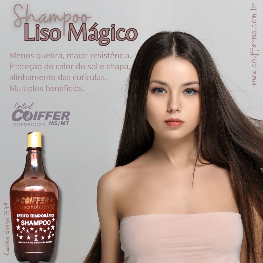 SHAMPOO LISO MAGICO TEMPORARIO COIFFER 1L Finalidade: Menos quebra, maior resistência. Proteção do calor do sol e chapa, alinhamento das cutículas. Multiplos benefícios. Modo de Uso: Molhar os fios, aplicar, massagear, deixar agir de 2 à 5 minutos, após enxaguar. Categoria: Shampoo